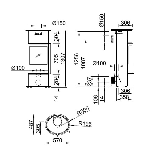– Ein mit Stahlverkleidung oder Natursteinverkleidung seitlicher Speicher: mit Speichermasse ausgegossenes Modell